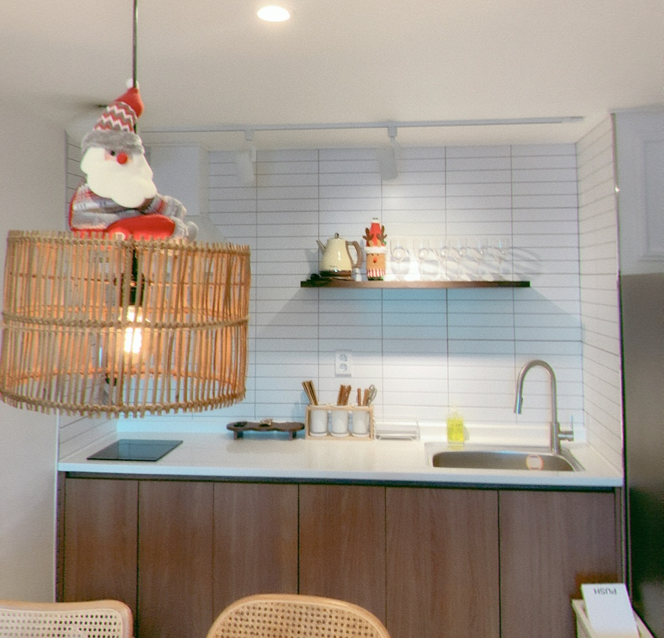 주방비품으로는 냉장고,인덕션,전자레인지숟가락,젓가락,포크,주방세제,일회용 수세미, 일회용 행주, 국자, 집게, 가위, 칼, 과도, 쟁반, 도마, 채반, 샐러드볼, 2인식기(밥, 국그릇, 사이드 그릇 2종), 컵, 냄비 2종, 프라이팬, 냄비받침대, 커피포트가 구비되어 있습니다.