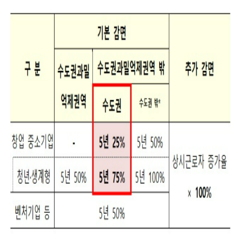 적용기한이 2027년 12월 31일까지 3년 연장되었습니다. 고용 증가 시 감면율이 기존 50%에서 100%로 인상되었으며, 연간 감면 한도는 5억 원으로 설정되었습니다.